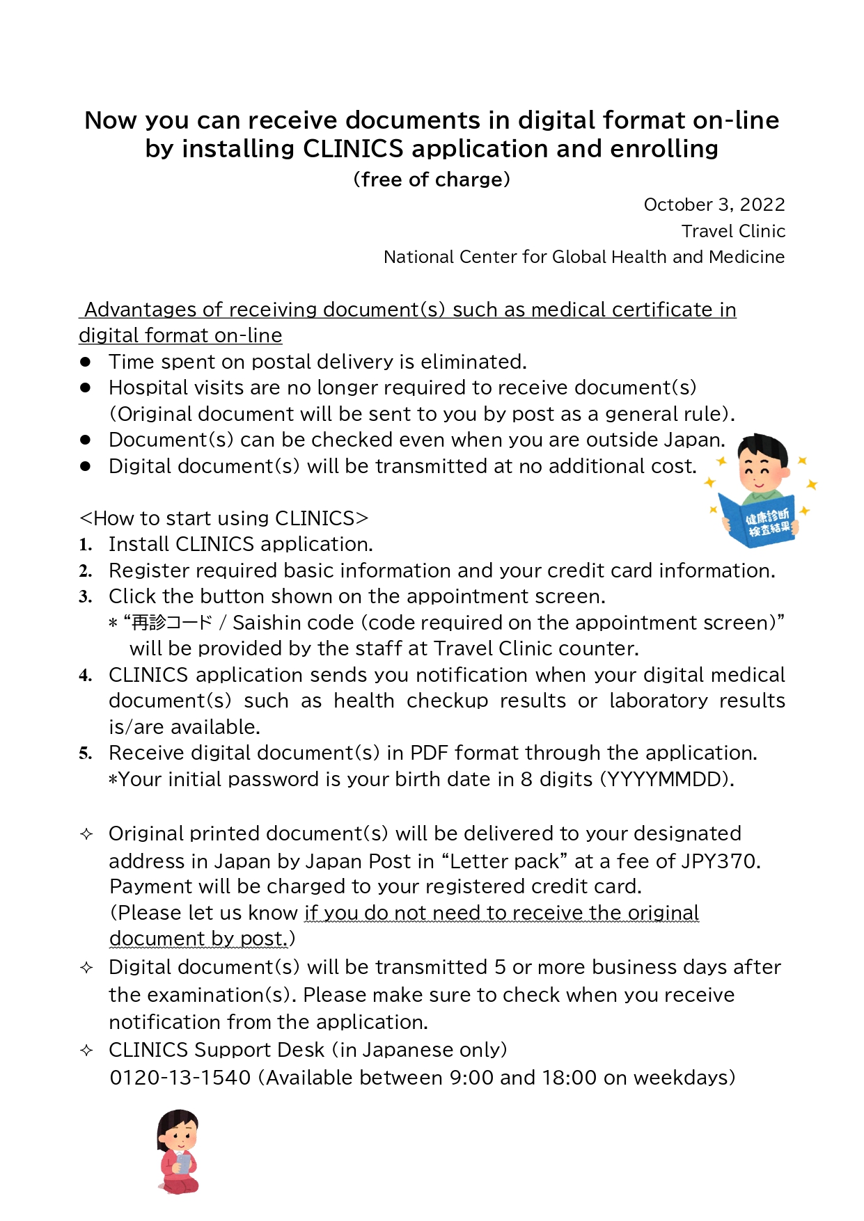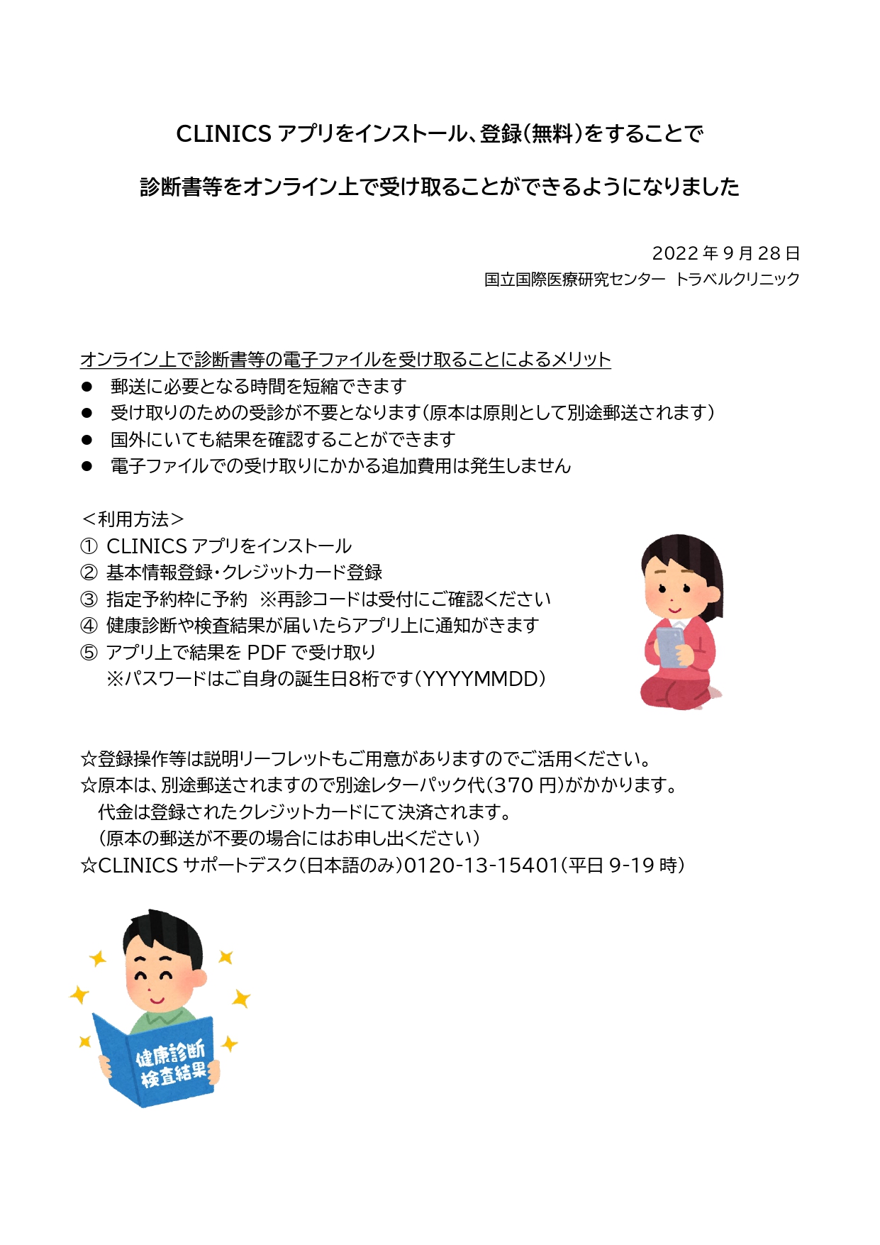 その他、提供させていただくサービス(ワクチン接種、検査、証明書作成、診察料<受診のみの場合>等)に応じて、追加の費用が必要となります。 - 既定の書式で健康診断書又は留学関連書類の作成等を希望される方は、事前に当クリニックでの対応が可能かどうかを確認するためフォーム等の関連書類を送付いただくことがあります。